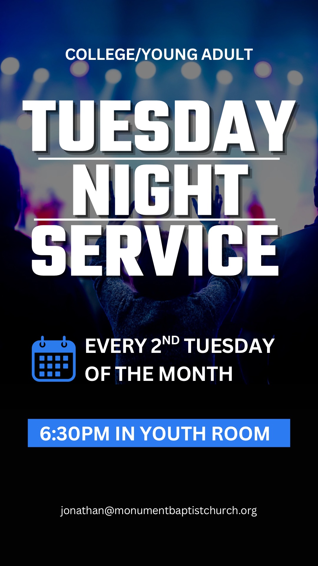 Our group meets on Tuesday nights at 6:30pm in the Youth room for our Small Group Bible Study Discussion as well as Sunday mornings at 10am for Sunday school in the choir room. For more information, feel free to email our college/young adult Minister.
